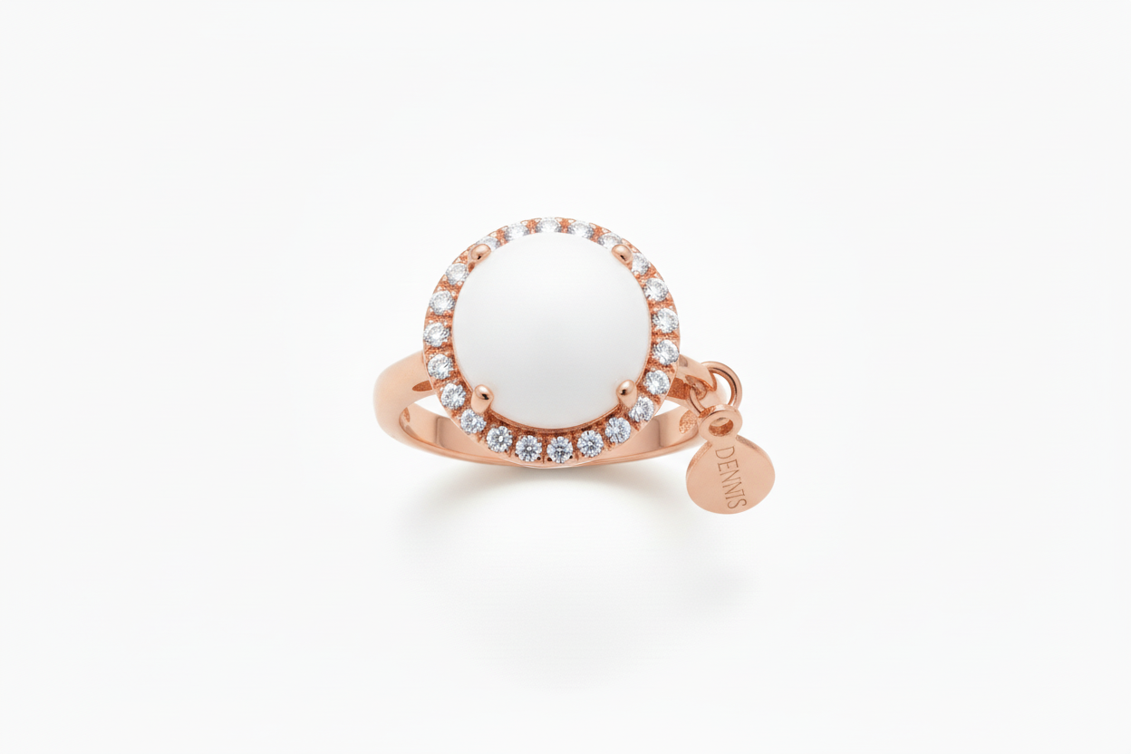 Anello con Pietra di Latte Materno a forma Tonda e Giro di Diamanti in Oro Rosa 18 Carati