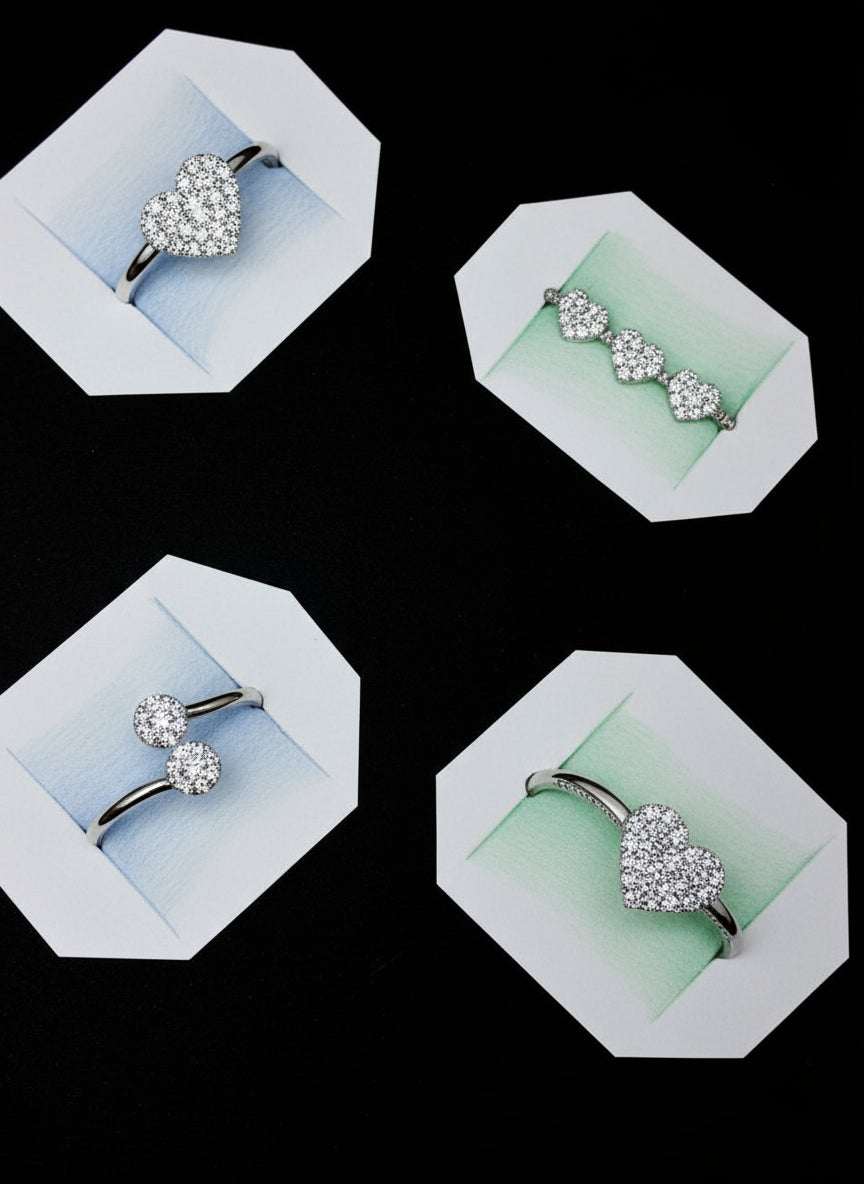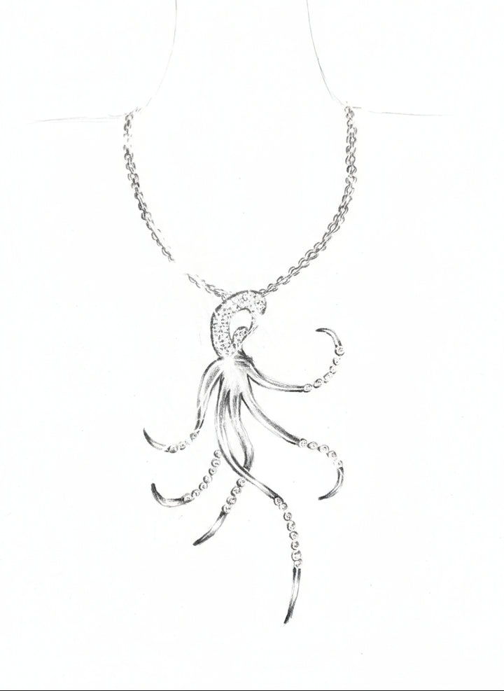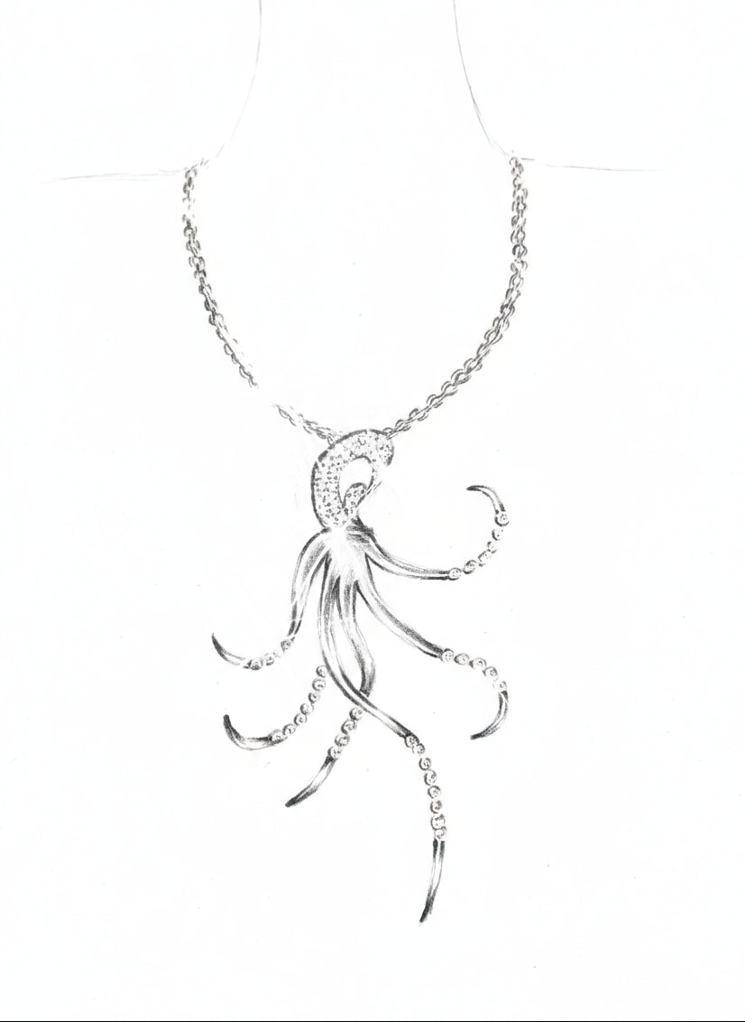 Vi presentiamo vari disegni realizzati a mano di idee di gioielli personalizzati.