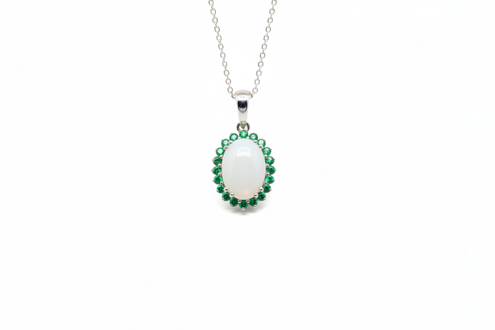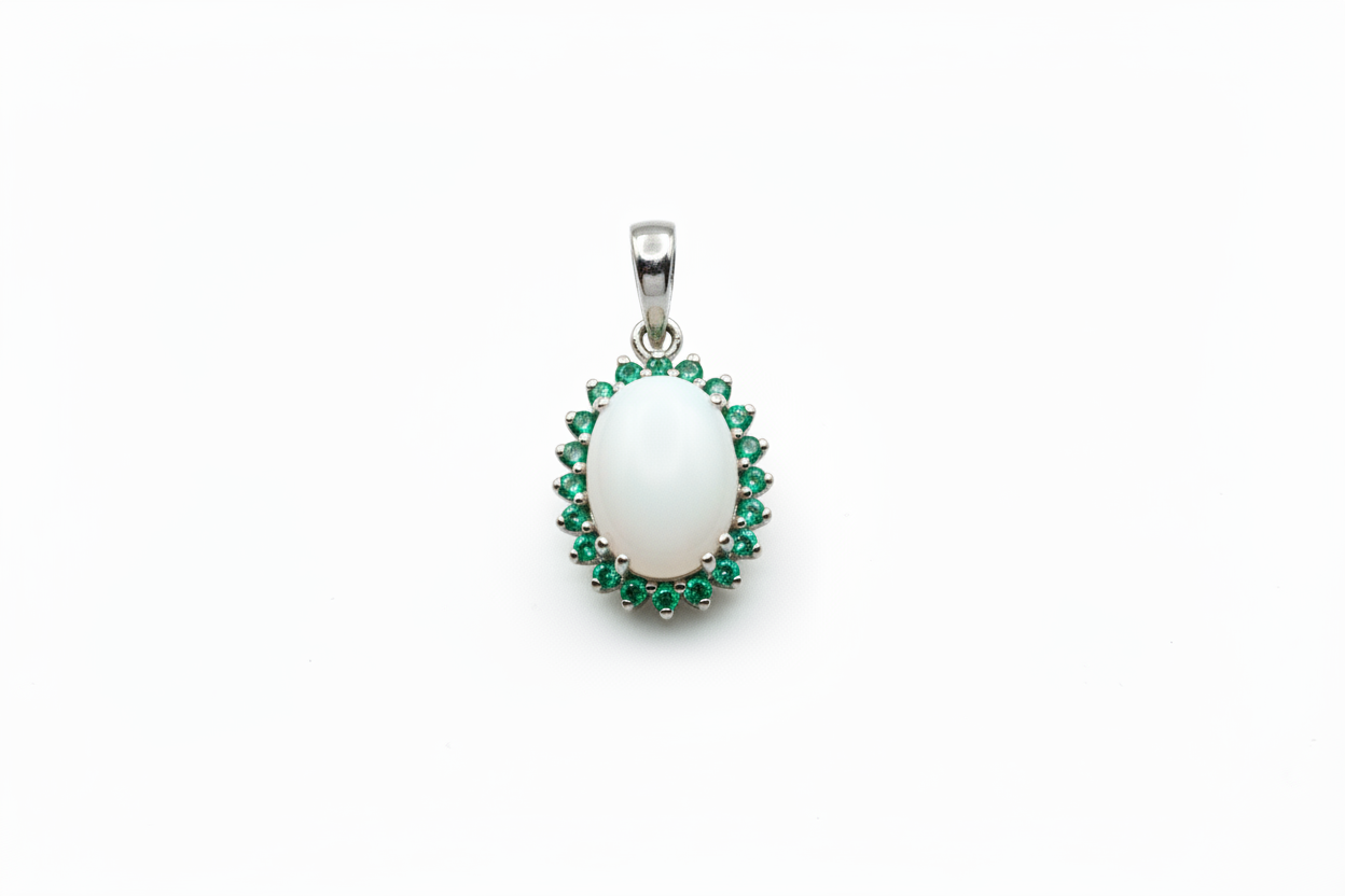 Ciondolo con Pietra di Latte Materno a Forma Ovale in Oro Bianco 18 Kt. e giro di Smeraldi