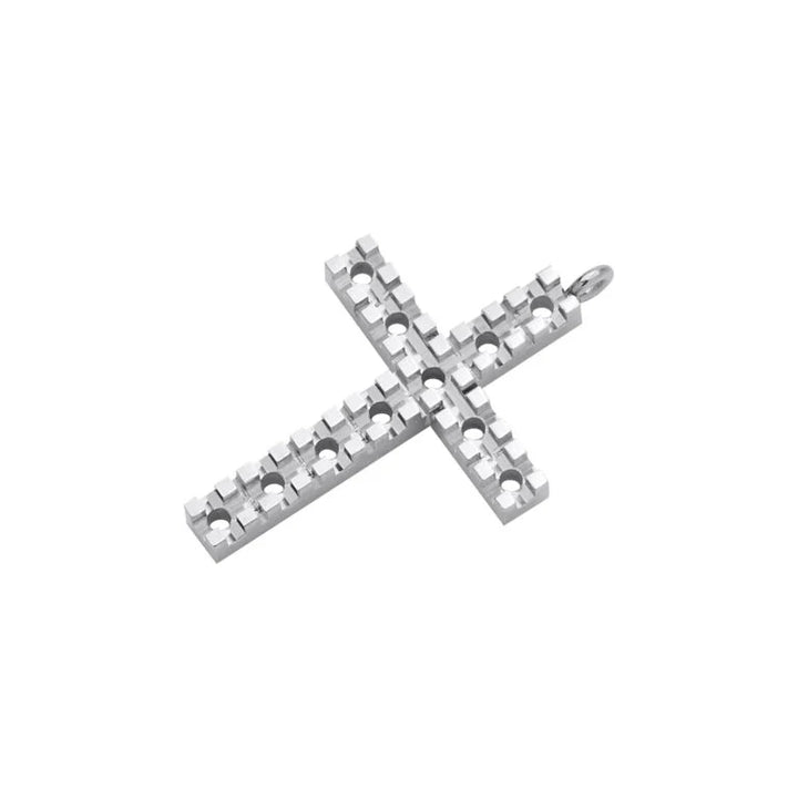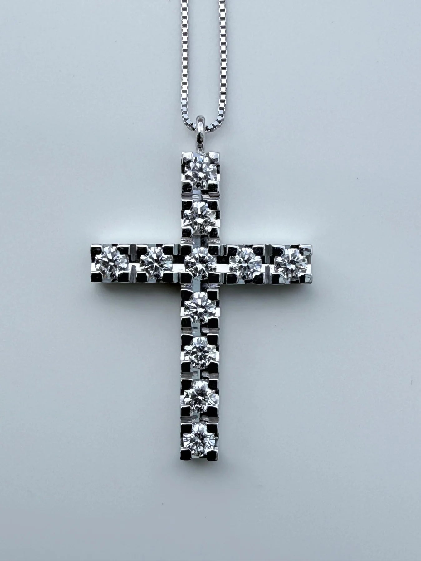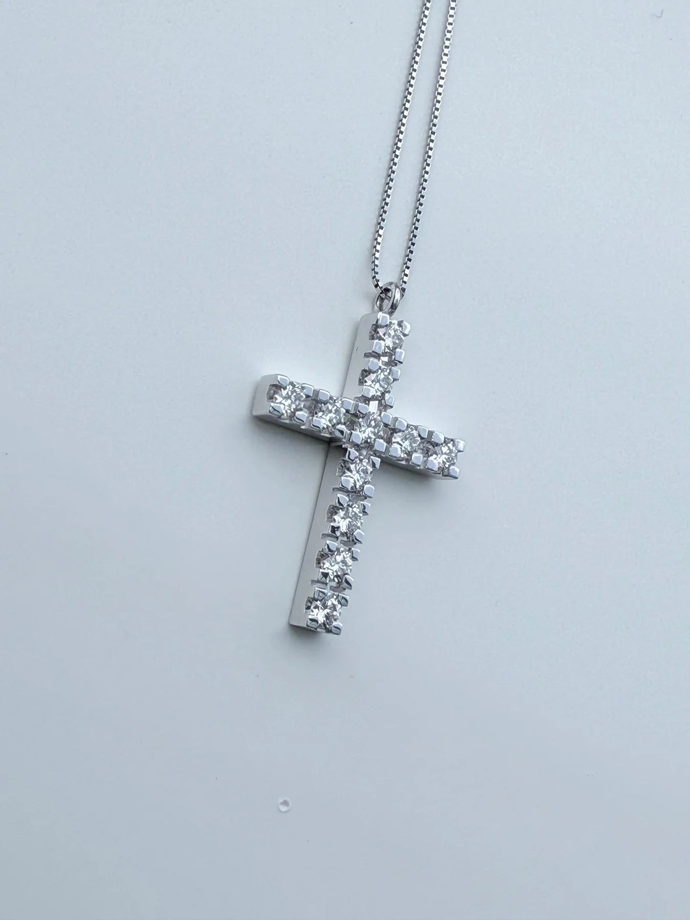 Croce con base quadrata impreziosita da diamanti, un gioiello raffinato che cattura l’attenzione con eleganza.