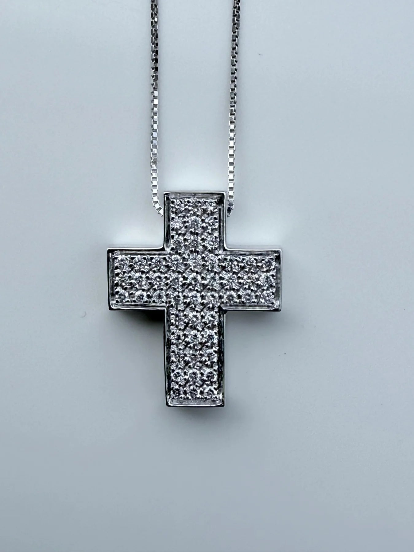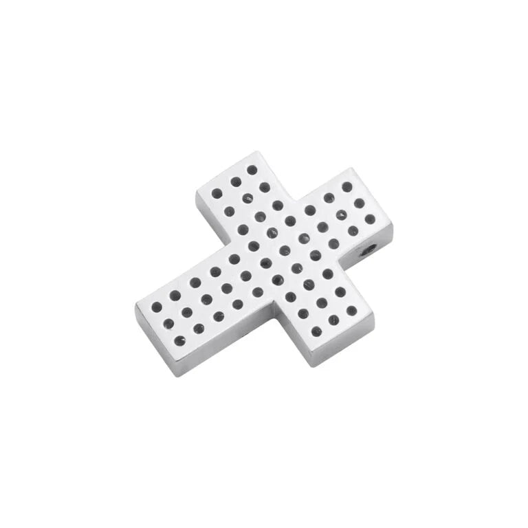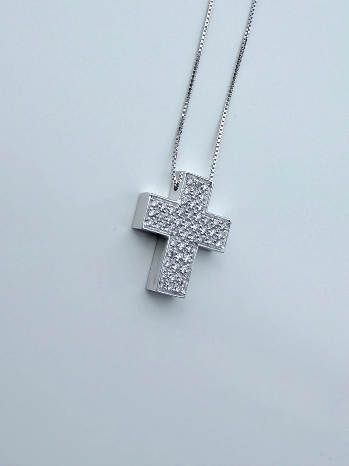 Croce scatolata con catena passante, alta 17 mm, ideale per arricchire il tuo outfit quotidiano con un dettaglio raffinato ed elegante.