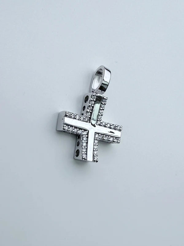 Croce con base quadrata impreziosita da diamanti, un gioiello raffinato che cattura l’attenzione con eleganza.