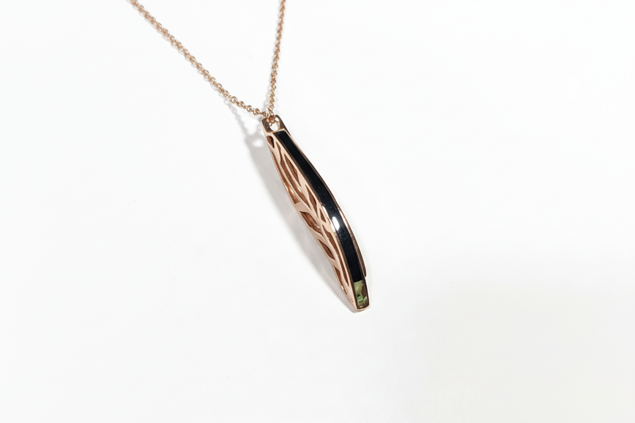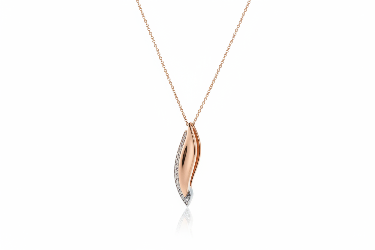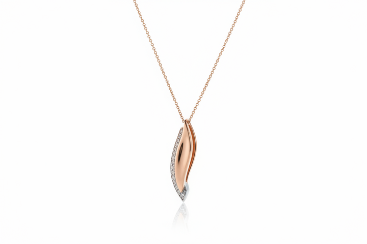 Ciondolo Oro Rosa 18 Carati a Forma di Foglia con Diamanti ct. 0.10, con traforo retrostante artistico, il tutto realizzato rigorosamente a mano.