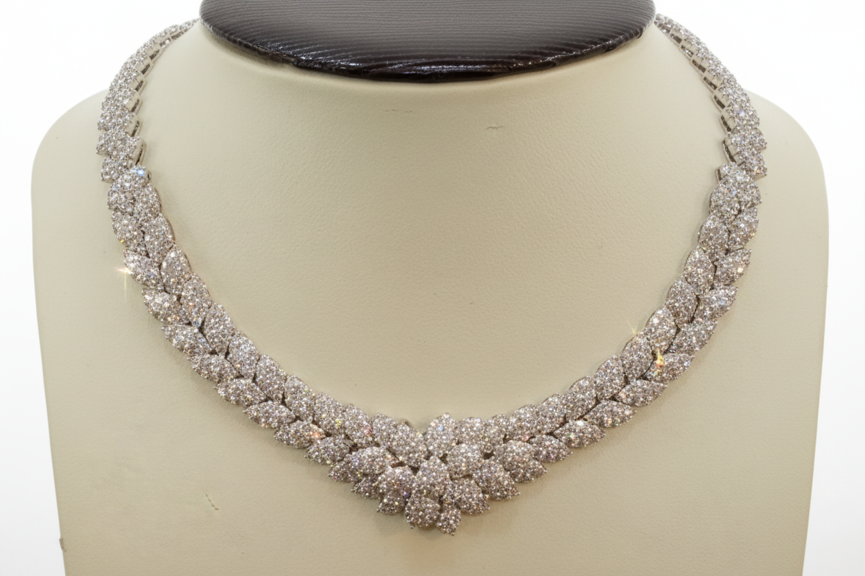 Questo collier in oro bianco dal modello principesco incarna la maestosità e il fascino regale, impreziosito da diamanti del peso di ct.30 che brillano con splendore incomparabile. Ogni dettaglio è stato curato con precisione per creare un'opera che evoca eleganza nobiliare e sofisticazione senza pari. Indossare questo gioiello significa sentirsi protagonista di una storia di lusso e grandezza, un accessorio che trasforma l'ordinario in straordinario. Perfetto per chi non scende a compromessi e desidera un pezzo che rispecchi il proprio gusto raffinato e la propria personalità regale.