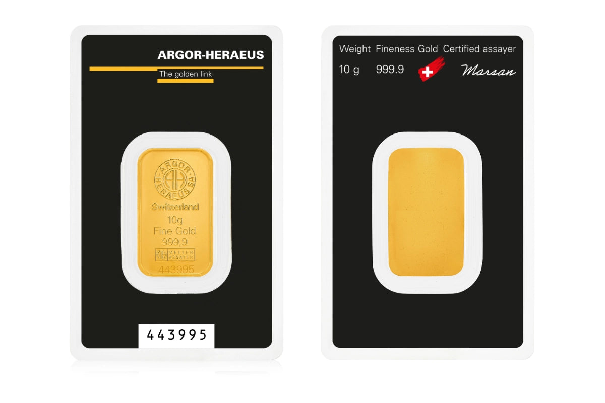 Lingotto d'oro puro da 10 grammi certificato Argor-Heraeus, il massimo standard di qualità nel settore. Realizzato in oro 24 carati (999.9), rappresenta un investimento tangibile e duraturo nel tempo. La purezza garantita e il prestigio del marchio svizzero lo rendono una scelta ideale per chi desidera possedere oro di eccellenza. Perfetto per collezionisti e investitori che cercano solidità e valore autentico.