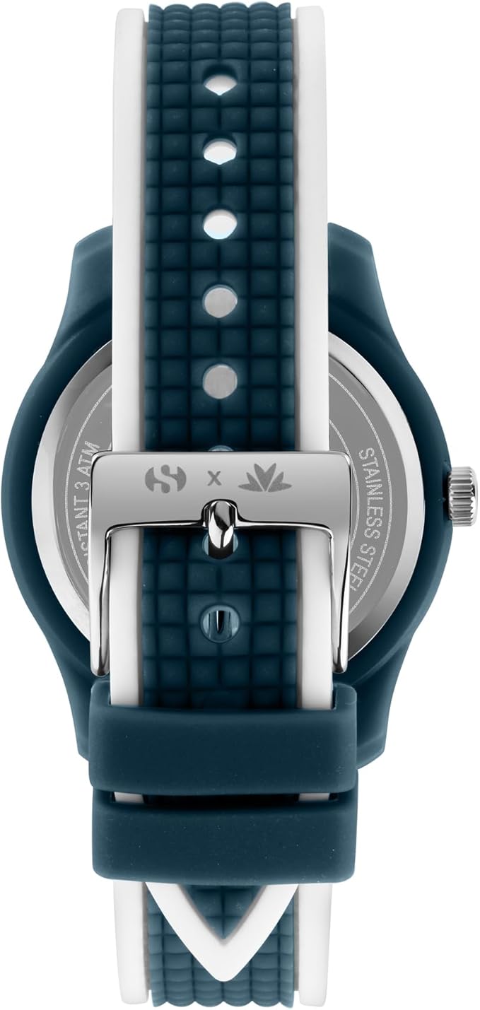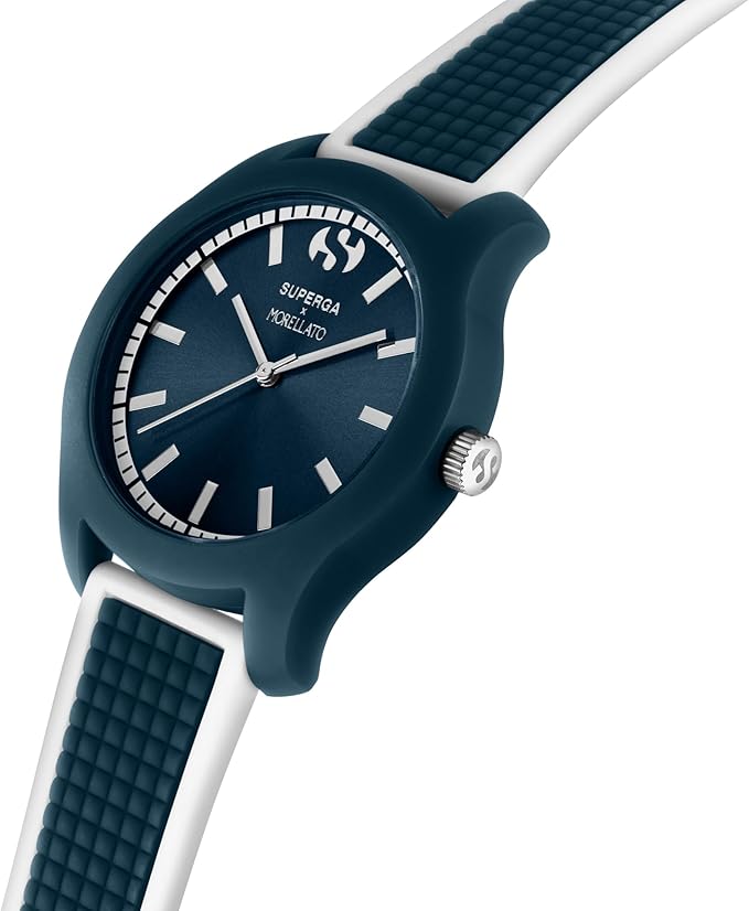 L'orologio Morellato in collaborazione con Superga è un segnatempo da uomo dal design vivace e sportivo. Realizzato in policarbonato con cinturino in silicone bianco, questo orologio analogico offre un movimento al quarzo con funzione solo tempo, 3H, e una resistenza all'acqua fino a 3 ATM. La cassa rotonda misura 38.00 mm di diametro e 8.70 mm di spessore, mentre il quadrante è protetto da un vetro in plastica e presenta indici e lancette bianchi per una lettura chiara. Dettagli distintivi come il logo "Superga x Morellato" sul quadrante e la trama del cinturino che richiama la suola delle scarpe Superga arricchiscono questa limited edition di autenticità e stile. L'orologio è presentato in uno special
