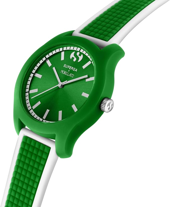 L'orologio Morellato in collaborazione con Superga è un segnatempo da uomo dal design vivace e sportivo. Realizzato in policarbonato con cinturino in silicone bianco, questo orologio analogico offre un movimento al quarzo con funzione solo tempo, 3H, e una resistenza all'acqua fino a 3 ATM. La cassa rotonda misura 38.00 mm di diametro e 8.70 mm di spessore, mentre il quadrante è protetto da un vetro in plastica e presenta indici e lancette bianchi per una lettura chiara. Dettagli distintivi come il logo "Superga x Morellato" sul quadrante e la trama del cinturino che richiama la suola delle scarpe Superga arricchiscono questa limited edition di autenticità e stile. L'orologio è presentato in uno special