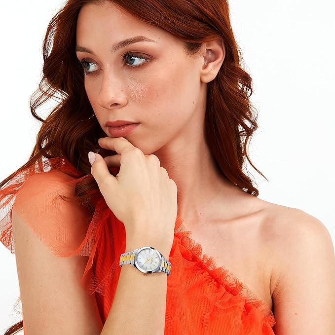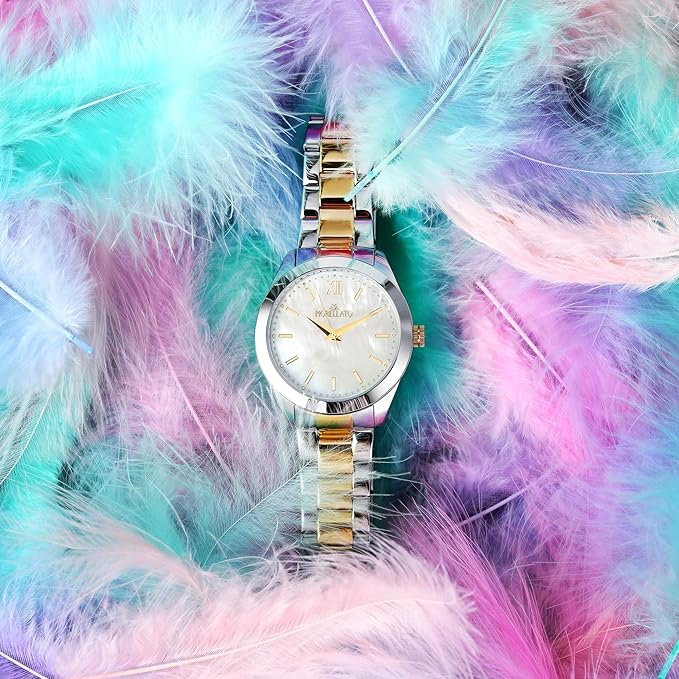 L'eleganza si fonde con la praticità in questo raffinato orologio da donna in acciaio. Il quadrante madreperla irradia una luminosità unica, arricchito da lancette e indici dorati che sottolineano l'essenza del tempo con stile. Il movimento al quarzo assicura precisione nel segnare le ore.