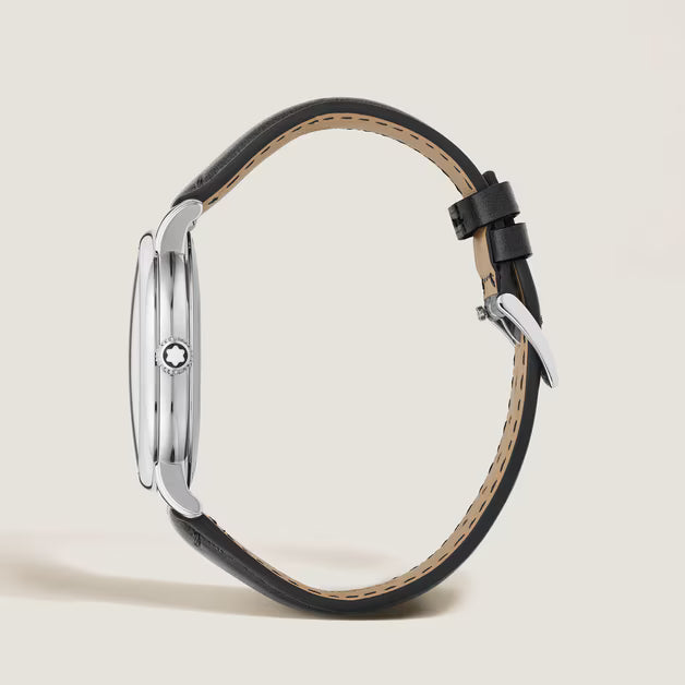 Montblanc Star Legacy Automatic Date eleva gli standard di eleganza dei codici di design raffinati della Maison. Il segnatempo presenta un quadrante sfumato antracite con motivo guilloché a stella variabile, filet sauté, numero romani finitura rodio, lancette a foglia e indica ore, minuti, secondi e data con uno stile semplicemente elegante. Questo modello è alimentato dal movimento automatico MB 24.17 ed è racchiuso in una cassa a forma di ciottolo da 42 mm in acciaio pregiato con fondello aperto che permette di contemplare la massa oscillante decorata con l’emblema Montblanc. Il cinturino intercambiabile in pelle di vitello antracite è stato disegnato dal Direttore Artistico di Montblanc Marco Tomasetta, che si è ispirato alla forma appuntita dei pennini degli strumenti da scrittura della Maison, esaltata da un effetto sfumato verticale.