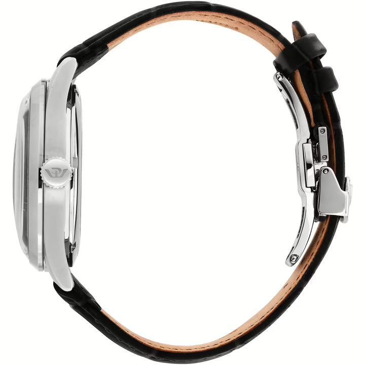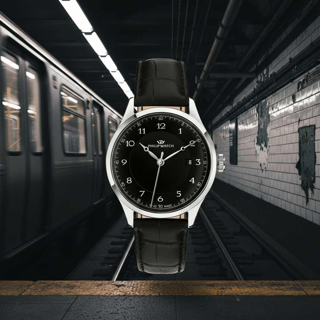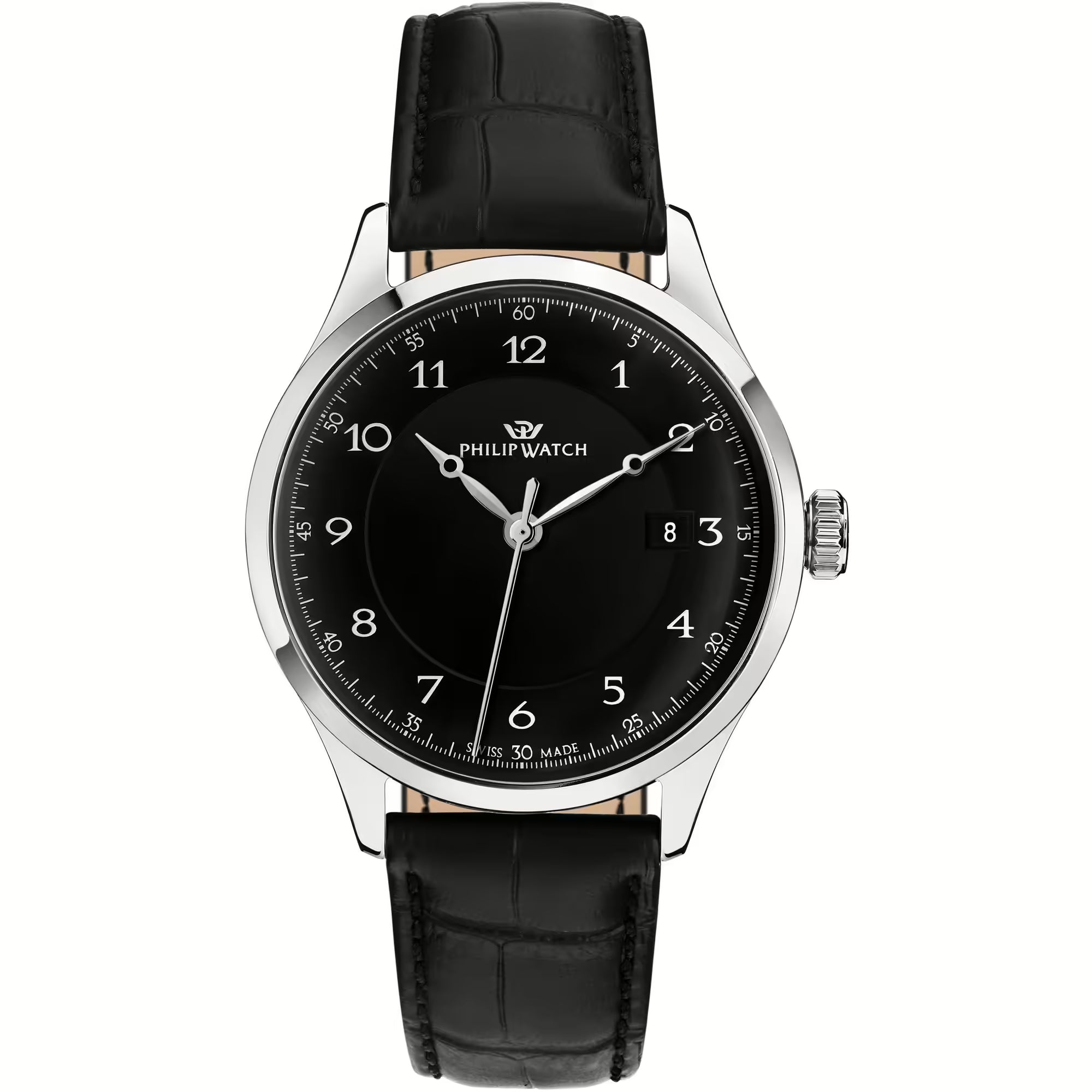 Philip Watch Orologio da uomo, ref. R8251225002, Collezione MUSEUM, in acciaio, pelle naturale, movimento al quarzo, funzione tempo, data. L'orologio è caratterizzato da un cinturino in pelle. La cassa dell'orologio misura 40mm e circonda un quadrante nero. Resistenza all'acqua fino a 10 ATM.