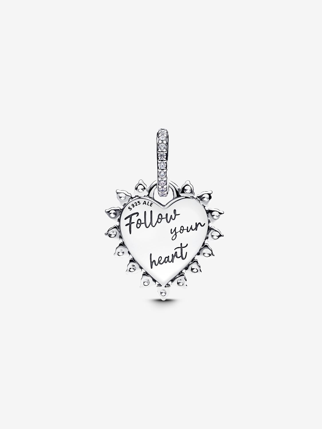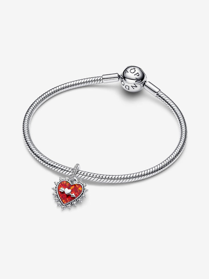 Questo charm in Argento Sterling 925 presenta una freccia girevole e un cuore luminoso realizzato con un opale rosso creato in laboratorio. L'incisione "Follow your heart" (Segui il tuo cuore) e le pietre incastonate a pavé aggiungono luminosità e un tocco romantico.