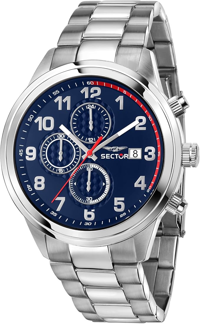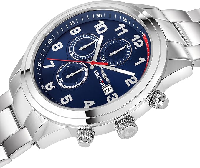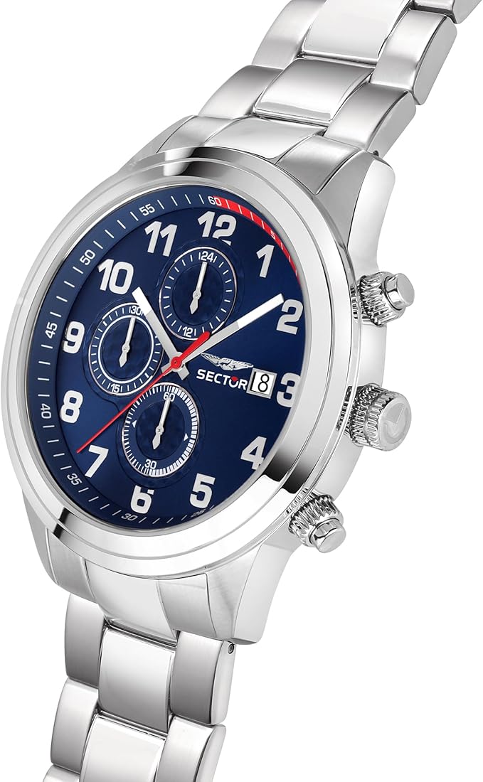 Orologio cronografo da uomo di Sector della collezione 670. Orologio con cassa in acciaio lucido e satinato di 43 mm con vetro minerale. Bracciale in metallo di colore argento con chiusura a fibbia diver con blocco sicurezza. E resistenza all'acqua di 10 atm. La referenza è r3273740003