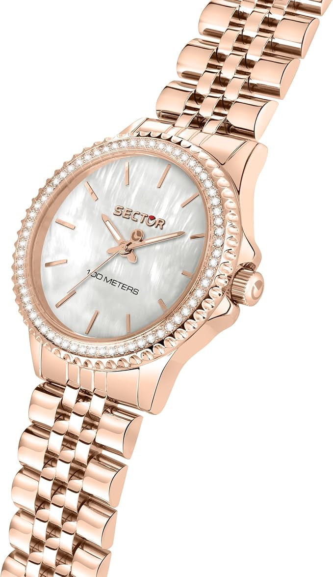 Orologio solo tempo da donna di Sector della collezione 230. Orologio con cassa in acciaio lucido di 32 mm con vetro minerale. Bracciale in metallo di colore oro rosa con chiusura a fibbia diver con blocco sicurezza. Cronografo up e datario a ore 3 e resistenza all'acqua di 10 atm. La referenza è r3253161537