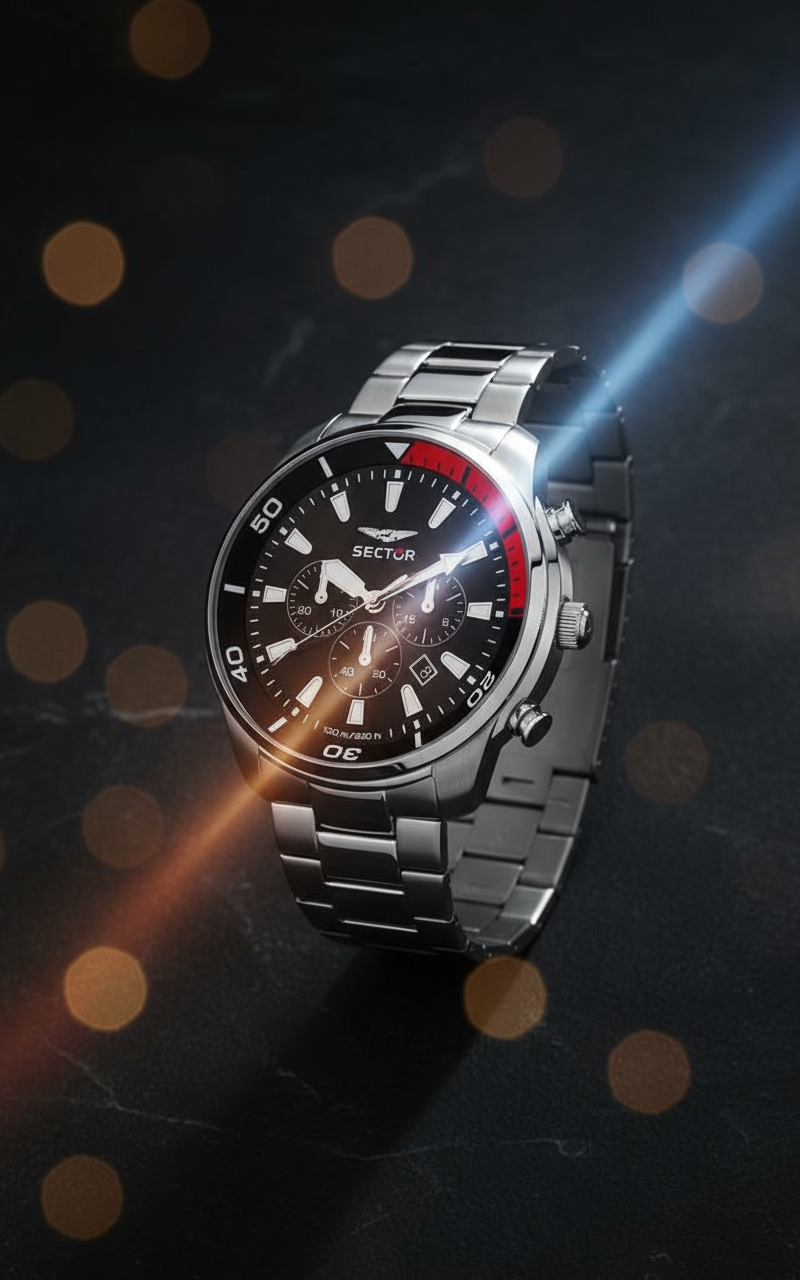 Sector Orologio da uomo, ref. R3273602018, Collezione OVERSIZE, in acciaio, movimento al quarzo, funzione cronografo. L'orologio è caratterizzato da un cinturino in acciaio, con chiusura a scomparsa con fermo di sicurezza. La cassa dell'orologio misura 48mm, circonda un quadrante nero e monta un resistente vetro minerale. Resistenza all'acqua fino a 10 ATM.L'orologio è contenuto nella sua confezione originale, con certificato di garanzia 2 anni.