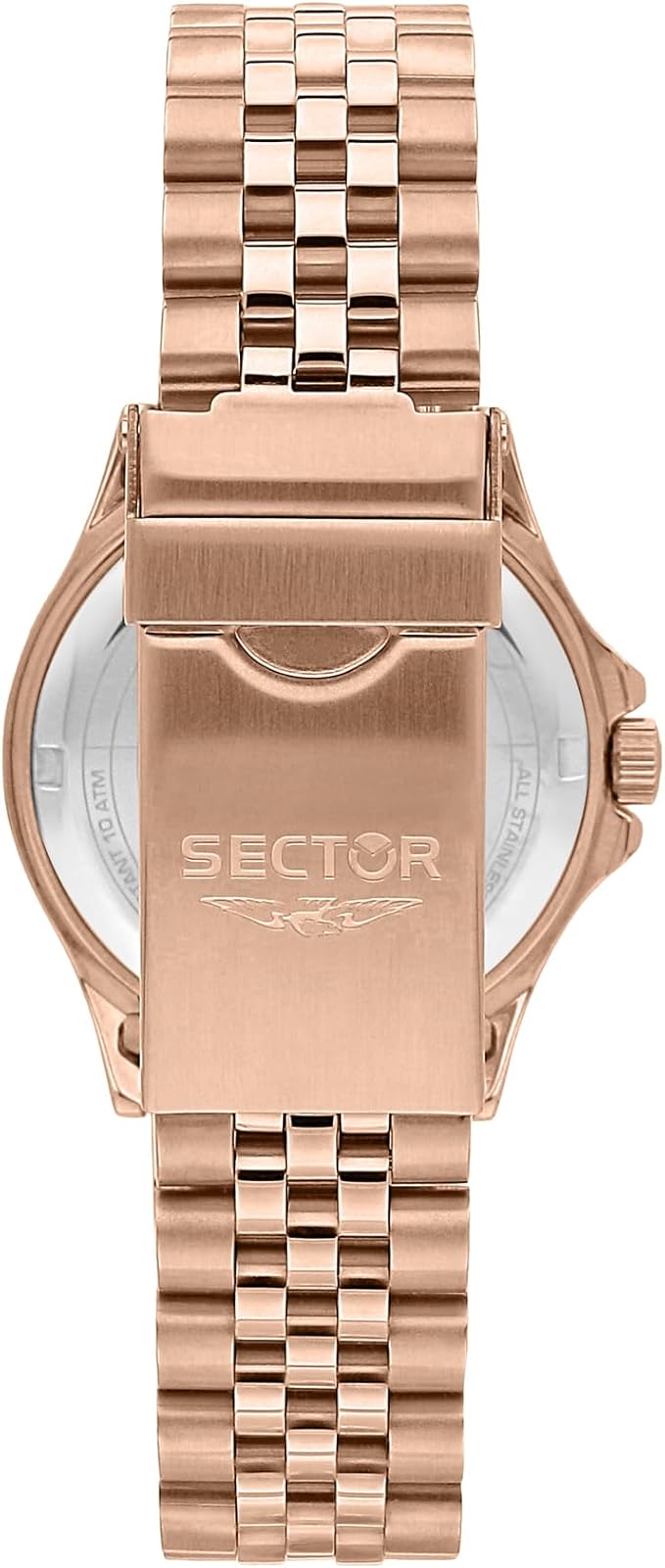 Orologio solo tempo da donna di Sector della collezione 230. Orologio con cassa in acciaio, lucido della dimensione di 35mm con vetro minerale. Orologio a 3 lancette con bracciale in metallo di colore oro rosa con chiusura a fibbia diver con blocco sicurezza. La resistenza all'acqua è di 10 atm. La referenza è r3253161531